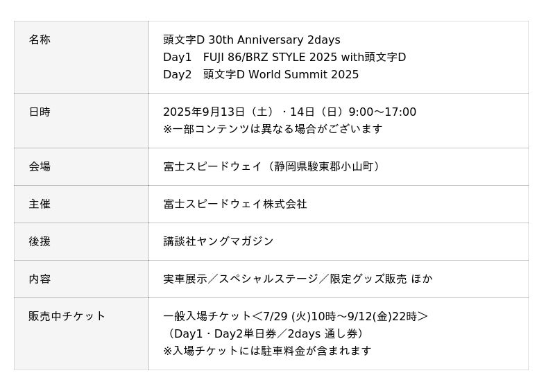 富士スピードウェイ株式会社(本社:静岡県駿東郡小山町)は、講談社ヤングマガジンの後援のもと、伝説的大ヒット漫画『頭文字D』(著:しげの秀一)の連載開始30周年を記念したスペシャルイベント「頭文字D 30th Anniversary 2days」を、2025年9月13日(土)・14日(日)の2日間開催いたします。
