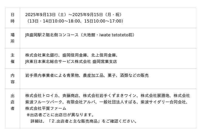 9月13日(土)~15日(月)の3日間限定!初出店事業者も参加する地域密着のマルシェを盛岡駅エキナカで開催します!