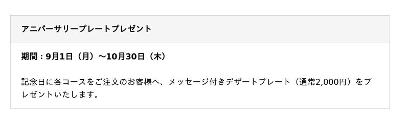 創業以来、アメリカンスタイルの本格プライムリブをお届けし、多くのお客様にご愛顧いただいてまいりました。今回の節目を記念して、特別なアニバーサリープランをご用意しました。人気のパーティープランをお得に楽しめるほか、コースには記念のデザートプレートをサービスいたします。感謝の気持ちを込めた特別企画で、心躍るひとときをお届けいたします。
