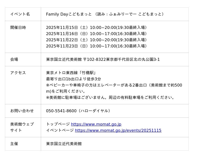 東京国立近代美術館(MOMAT、千代田区・北の丸公園)は、2025年11月15日(土)、16日(日)、22日(土)、23日(日)に「Family Dayこどもまっと」を開催します。「こどもまっと」の主役は子どもたち。声をあげて泣いたり笑ったりしても、周りを気にせずに、お子さま連れで気兼ねなく美術館を楽しめる、特別な4日間です。