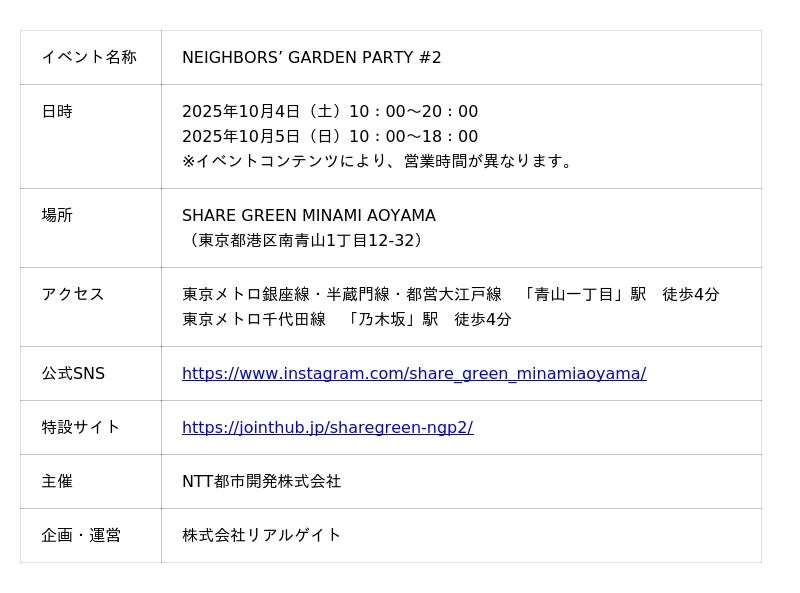 NTT都市開発株式会社(本社:東京都千代田区、代表取締役社長 池田 康)は、「SHARE GREEN MINAMI AOYAMA」(東京都港区南青山1丁目)にて、コミュニティイベント「NEIGHBORS’ GARDEN PARTY #2」を10月4日(土)・10月5日(日)の2日間にわたって開催します。