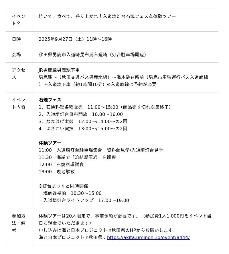 昨年初めて開催され、多くのお客さんにご来場いただいた「入道埼灯台石焼フェス&体験ツアー」ですが、今年は、秋田海上保安部と男鹿市が開催している「灯台まつり」と同時開催となり、より一層の盛り上がりが期待されます。会場では、石焼にまつわる多彩なフードが集結し、地元ならではの味を楽しむことができます。また、なまはげ太鼓やよさこい演技などのステージイベントも予定されており、来場者を魅了する内容となっております。さらに当日は入道埼灯台に無料で登る事ができるほか、夕方からは灯台のライトアップも実施され、幻想的な景観を楽しむことができます。