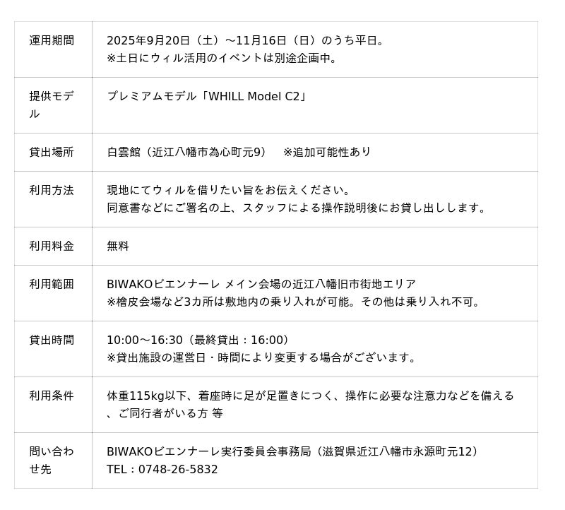 WHILL株式会社(本社:東京都品川区、代表取締役社長 CEO:杉江理、以下「WHILL社」)は、国際芸術祭BIWAKOビエンナーレ実行委員会主催のもと2025年9月20日から滋賀県近江八幡市で開催される「BIWAKOビエンナーレ2025」において、免許不要の近距離モビリティWHILL(ウィル)を活用した移動サービス「WHILLモビリティサービス」が採用されることを発表いたします。昔ながらの街並みが広がる近江八幡旧市街地のメイン会場に安心快適に移動できるアクセシビリティを整備することで、年齢や国籍、身体状況などに関わらず誰もがアートや芸術に触れ、心ゆくまで楽しめる鑑賞体験を提案するものです。