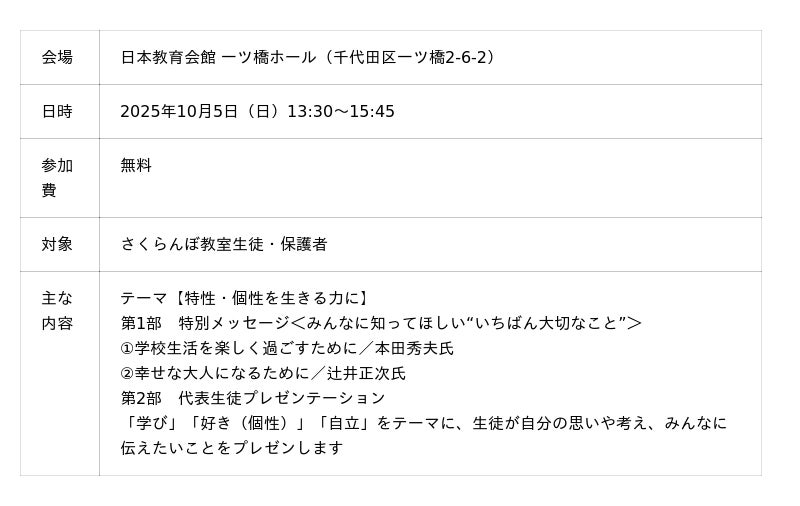 教育も社会も大きな変化を遂げる中、発達障害(神経発達症)の知識や、多様性という言葉が社会に広まってきました。さくらんぼ教室は教育を通して「あなたにはできることがたくさんある」「その方法は周りの人と違っていてもよい」「今できないことも、変わっていく」ことを、生徒や保護者に伝え続けてきました。このイベントを通して、「一人ひとりの持つ発達特性や個性は生きる力になる!」という新しい価値観、メッセージを、発達障害教育を35年実践してきたさくらんぼ教室が生徒と共に発信します。