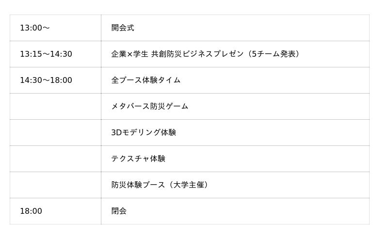 本イベントでは、大学生とロート製薬など5社の企業が混合チームを結成し、世界の防災課題解決に挑むビジネスピッチを実施。さらに、全来場者が参加できる5つの体験型ワークショップでは、メタバース防災シミュレーションから3Dモデリングまで、次世代防災テクノロジーを五感で体験できます。