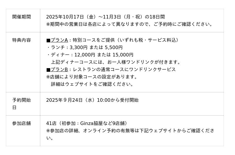 ▼予約方法、参加店の詳細はこちら:銀座レストランウィーク ウェブサイト