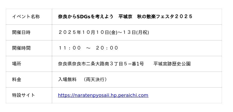 奈良市・平城宮跡歴史公園にて、秋恒例の「平城京 秋の散楽フェスタ2025」を下記のとおり開催いたします。平城京の朱雀門を舞台に、グルメ、芸能、体験型企画、そして迫力満点の花火大会まで、世代を超えて楽しめる一大イベントです。