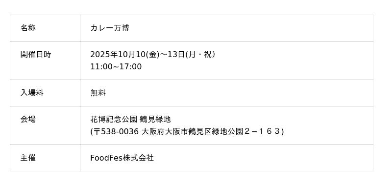 FoodFes株式会社(代表取締役:稲垣一馬)は2025年10月10日(金),11日(土),12日(日),13日(月)の3日間「カレー万博」を花博記念公園 鶴見緑地(大阪市鶴見区)にて開催いたします。