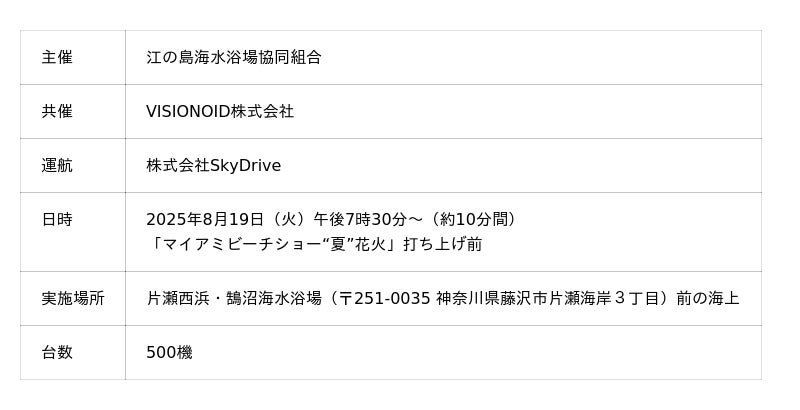 「空飛ぶクルマ」(※1)の開発およびドローン関連サービスを提供する株式会社SkyDrive(本社:愛知県豊田市、代表取締役CEO:福澤知浩、以下「SkyDrive」)は、2025年8月19日(火)、神奈川県藤沢市の片瀬西浜・鵠沼海水浴場にて開催されたイベント「江の島伝説 天女と龍神」において、500機のドローンによる大規模な演出を実施したことをお知らせします。