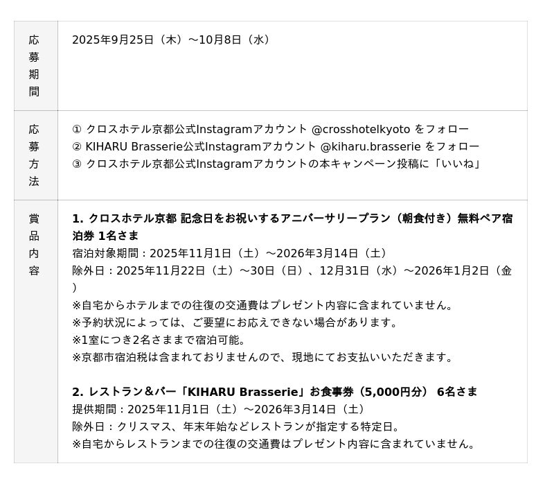 京都・河原町三条に位置するクロスホテル京都(所在地:京都府京都市中京区、総支配人:半明 義宏)は、開業7周年を記念し、記念日をお祝いするアニバーサリープラン宿泊券やレストラン&バー「KIHARU Brasserie」のお食事券が当たるInstagramキャンペーンを、2025年9月25日(木)~10月8日(水)まで開催します。