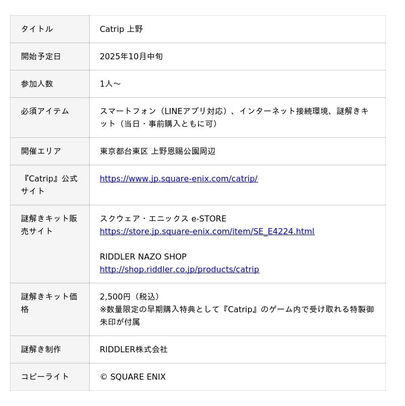 株式会社スクウェア・エニックス(本社:東京都新宿区、代表取締役社長:桐生 隆司)は、2025年10月中旬に、地域密着した観光周遊型の謎解きコンテンツ『Catrip』(キャトリップ)を開始いたします。第一弾の東京・上野編では松丸亮吾氏率いる「RIDDLER」が謎解き制作を担当、またJR東日本「JRE WALLET」との連携でデジタルクーポンを付与するなど、街・店舗を巡るリアルと“ちょっとフシギ”なファンタジーが交錯する周遊体験を提供します。