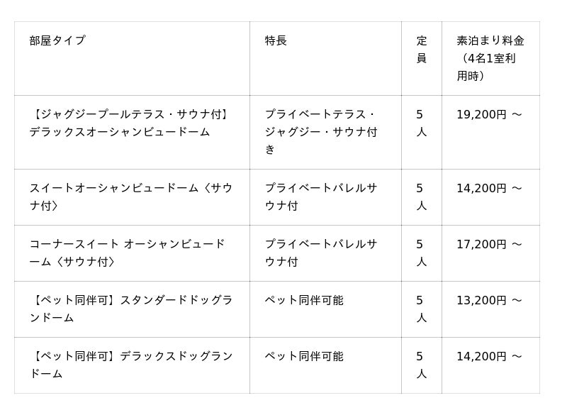 施設には、絶景のオーシャンビューを望むバレルサウナ付きルームや、愛犬と一緒に過ごせるプライベートドッグラン付きのお部屋をご用意。