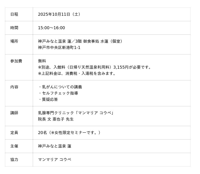 厚生労働大臣認定健康増進施設の「神戸みなと温泉 蓮」(総支配人:横山 秀樹 所在地:神戸市中央区)は、乳がんに関する理解を深め、早期受診・早期発見の大切さを伝える啓発運動「ピンクリボン」の趣旨に賛同し、ピンクリボン月間中である2025年10月11日に、乳腺専門クリニック「マンマリア コウベ」の院長 文 亜也子氏を講師に迎え、乳がんに関するセミナーを開催いたします。