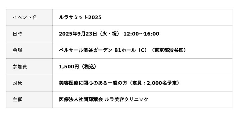 『永遠の美しさへの夢が、 夢に終わらない未来を創りあげること』を使命に掲げる、化粧品の研究開発・製造販売を行う株式会社エテルナム(本社:東京都渋谷区、代表取締役:松本隆明)は、2025年9月23日(火・祝)開催の、美容医療の“リアル”を見て、聞いて、体験できる体験型美容医療イベント「ルラサミット2025」に出展します。