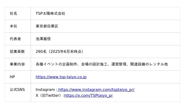 2025年で設立70周年を迎えたTSP太陽株式会社は、空間ソリューションによるイベントコンサルティングから企画・制作まで、あらゆる感動の場を一気通貫した支援で創造するプロフェッショナル集団です。国際的なビッグイベントを始め、あらゆるイベントに携わるデザイン・コンサルティング会社として、収益の最大化を図る事前収支計画から企画・クリエイティブ制作・建築設計・施工・運営までをトータルソリューションとして提供しています。PR・プロモーション・イベントに付随するホスピタリティサービスもお任せください。近年では、豊富な経験から培われた独自のノウハウを駆使し、ダイバーシティやSDGs・ESGへの取り組みを積極的に推進しています。