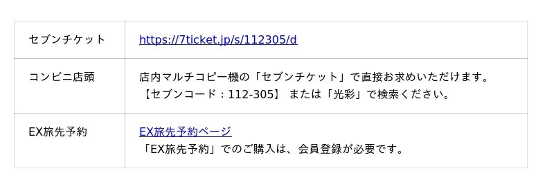 セブンチケット、EX旅先予約にてお求めください。現地では購入できません。