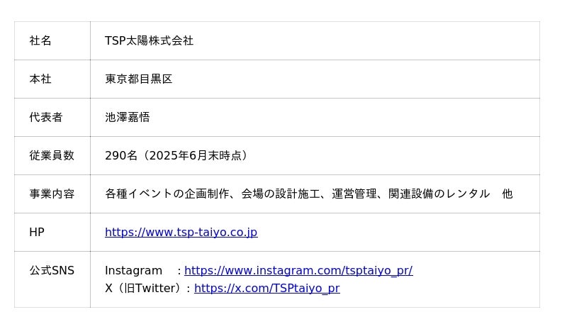 2025年で設立70周年を迎えたTSP太陽株式会社は、空間ソリューションによるイベントコンサルティングから企画・制作まで、あらゆる感動の場を一気通貫した支援で創造するプロフェッショナル集団です。国際的なビッグイベントを始め、あらゆるイベントに携わるデザイン・コンサルティング会社として、収益の最大化を図る事前収支計画から企画・クリエイティブ制作・建築設計・施工・運営までをトータルソリューションとして提供しています。PR・プロモーション・イベントに付随するホスピタリティサービスもお任せください。近年では、豊富な経験から培われた独自のノウハウを駆使し、ダイバーシティやSDGs・ESGへの取り組みを積極的に推進しています。