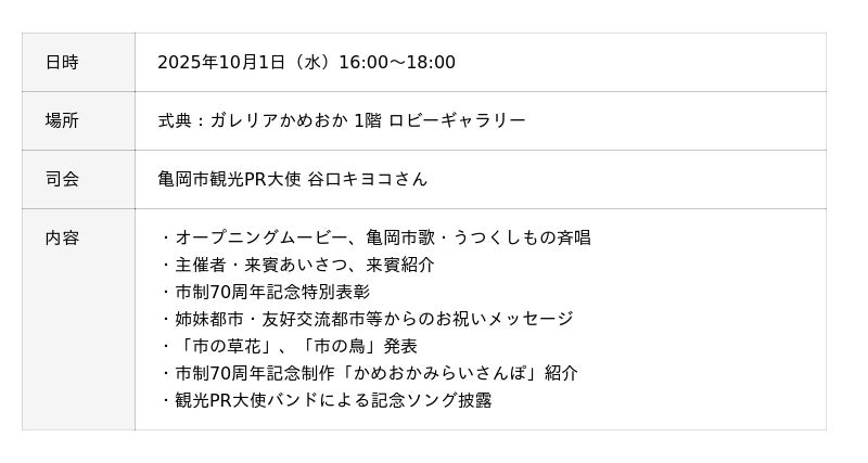 京都府亀岡市(市長:桂川孝裕)は、2025年1月に市制70周年を迎えたことを記念し、同年10月1日(水)に「ガレリアかめおか」で記念式典を開催します。本式典は、市民の皆様と共に築いてきた70年の歩みを振り返り、次の100年に向けた新たな一歩を踏み出すための祭典です。