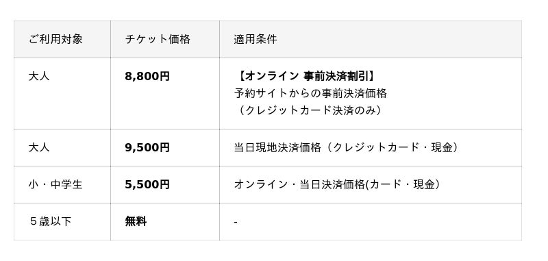 割引価格でのチケット購入(クレジットカード決済のみ)8,800円