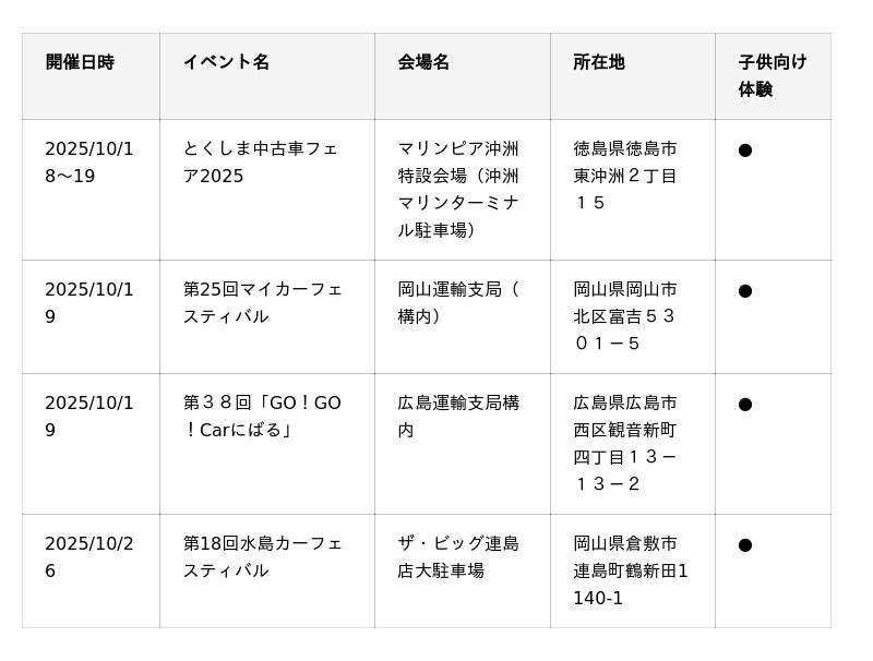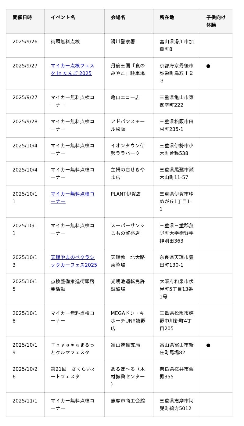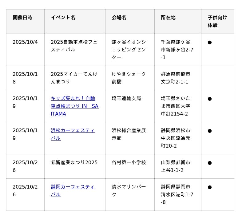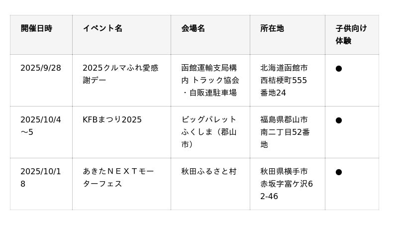 10~11月に開催するJMS 2025に加えて、各地で自動車整備イベントを開催します。未来を担う子どもたちに、クルマの世界の魅力、本物の職業体験に触れていただける子供向け体験コンテンツを用意している会場もあるので、ぜひご家族でお近くの会場に足を運んでみてください。■北海道・東北エリア