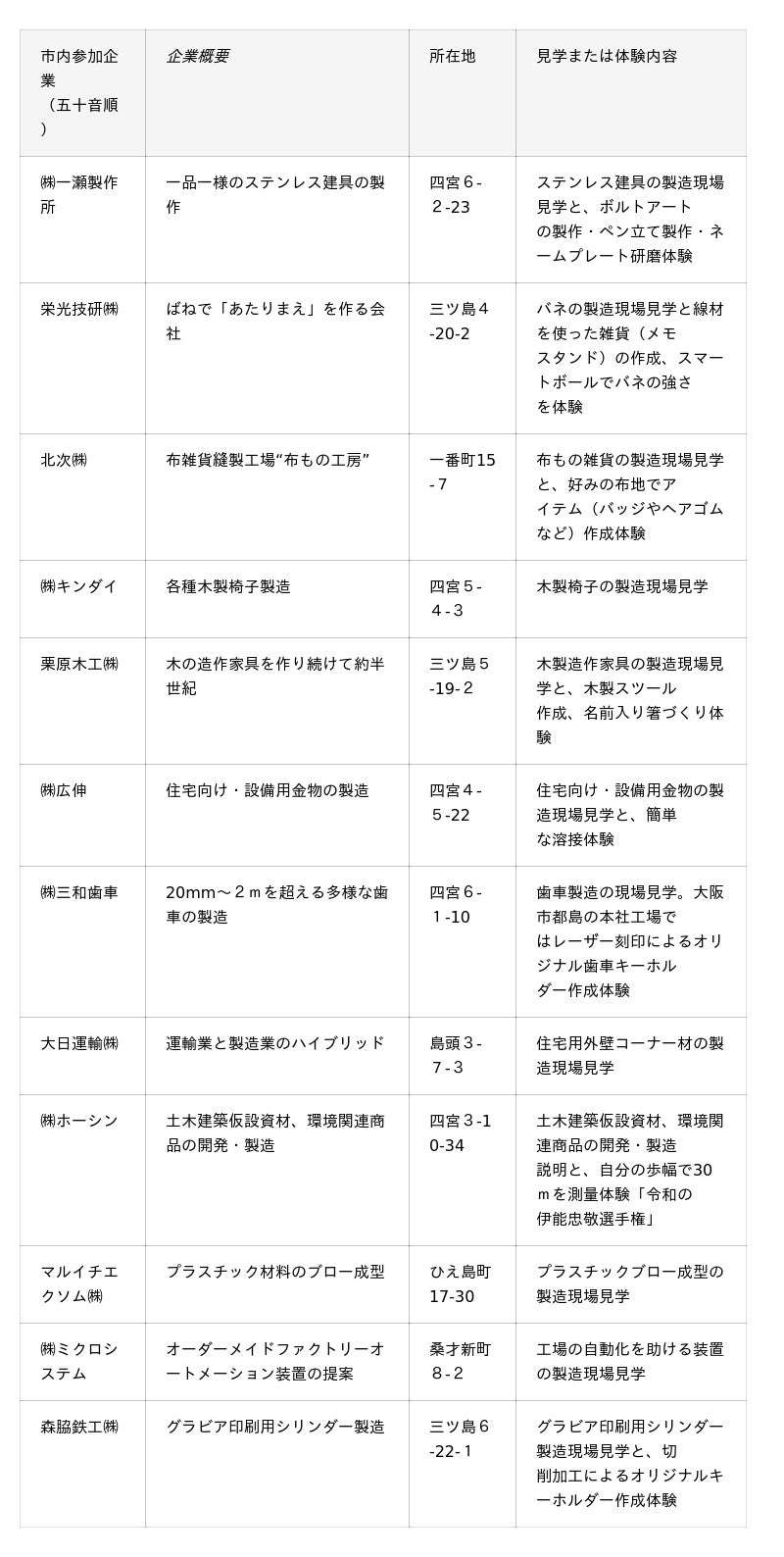 FactorISMとは ものづくりのまち門真市、八尾市などを舞台として、「こうばはまちのエンターテイメント」を合言葉に、ものづくりの現場を一般開放し、人々の生活を支え、世界を魅了する「ものづくり」を体験、体感してもらうイベントです。市内企業12社が参加します。この機会に市内のものづくり企業の魅力を体験、体感してみませんか。