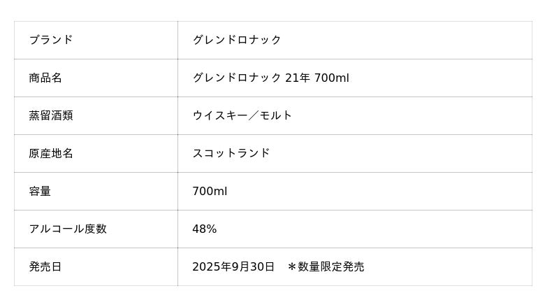 世界有数のスピリッツ会社であるブラウンフォーマン社の日本法人、ブラウンフォーマンジャパン株式会社(本社:東京都港区、代表取締役社長:アーロン・J・マーティン)は、シングルモルトスコッチウイスキー「グレンドロナック」より、「シェリーの王様」ペドロ・ヒメネス樽と厳選されたオロロソシェリー樽で熟成させた「グレンドロナック 21年」を、高級感あふれる新パッケージで2025年9月30日(火)より数量限定で出荷開始します。