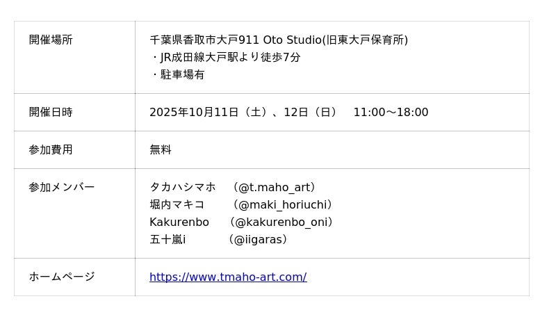 現代アーティスト タカハシマホさんが代表を務めるStudio ANOKO合同会社(千葉県香取市)は、オープンスタジオを10月11日(土)・12日(日)に開催します。このイベントは、アーティストが作業しているスペースや作品などを一般公開し、普段入りたくてもなかなか入ることのできないアトリエや作品を見学することができます。
