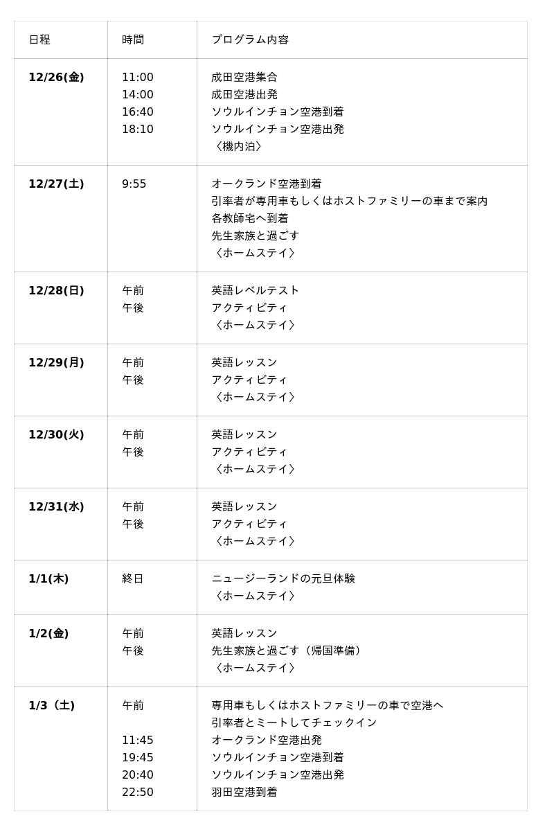 南半球の夏を迎えるニュージーランド・オークランドを舞台に、英語を教える有資格者である英語教師宅にホームステイするスペシャルプログラム。教育的配慮の行き届いた環境で、マンツーマンレッスンを通して、実践力を身につけます。また現地ならではの自然体験を通して、生きた英語や異文化交流を存分に体感します。英語教師のホストファミリーと一緒に、ニュージーランドの年末年始のイベントや大自然を満喫するプログラムにぜひご参加ください。