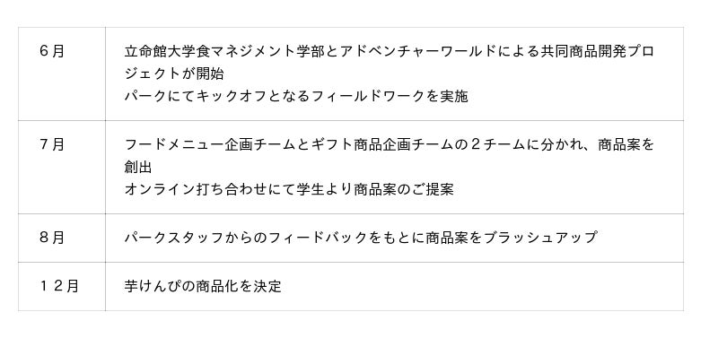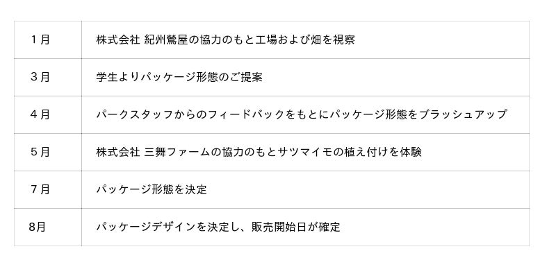 具体的な取り組みとして、2024年より立命館大学食マネジメント学部の学生が参画し、パークでの販売を目指した商品開発を進めてきました。その成果として、2025年9月27日(土)より、「スマイル芋けんぴ」「スマイル芋チップス」をパーク内ギフトショップ(AWおよびシンビオーシス)にて販売開始いたします。本商品は、幅広い世代に親しまれる味わいと手に取りやすい価格を目指して学生が企画したもので、学生の想いは商品名とパッケージに反映されました。また本商品は、株式会社 紀州鶯屋(所在地:和歌山県田辺市、代表:鎌倉 良行 様)および株式会社 三舞ファーム(所在地:和歌山県白浜町、代表:鎌倉 正明 様)のご協力により商品化が実現しました。販売初日には学生も来園し、販売準備やプロモーション活動を行います。