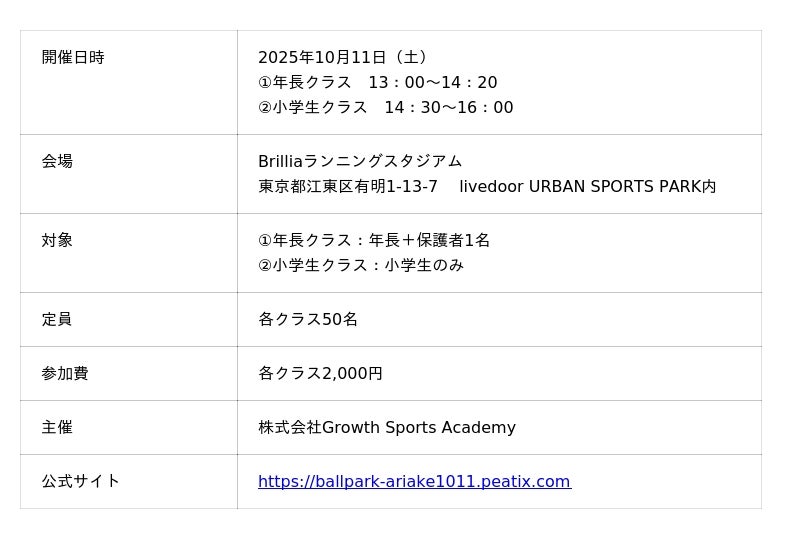 本イベントの開催期間中である10月11日(土)には、併設施設のBrilliaランニングスタジアムにて「GSA(Growth Sports Academy)ボールパークスポーツ体験会」を実施します。ラグビー元日本代表・斉藤祐也氏と世界陸上銀メダリスト・市橋有里氏による指導のもとラグビーやランニングを学ぶことができます。詳細はイベント公式サイトをご参照ください。