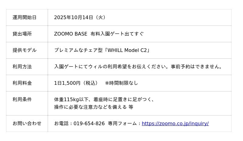 WHILL株式会社(本社:東京都品川区、代表取締役社長 CEO:杉江理、以下「WHILL社」)は、株式会社もりおかパークマネジメント(代表取締役:加藤彰)が管理運営する盛岡市動物公園ZOOMO(ズーモ)(所在:盛岡市新庄、園長:辻本恒徳、以下 「ZOOMO」)において、免許不要で歩行領域を走行する近距離モビリティWHILL(ウィル)を活用した園内移動サービス「ZOOMO-BILE(ズーモービル)」が提供開始されることを発表いたします。動物や地球環境にも配慮しながら、あらゆる人が勾配や凸凹道などが多い園内を快適に周遊できるアクセシビリティ環境をさらに整える狙いです。本サービスの導入は、東北地方の動物園では初となります。