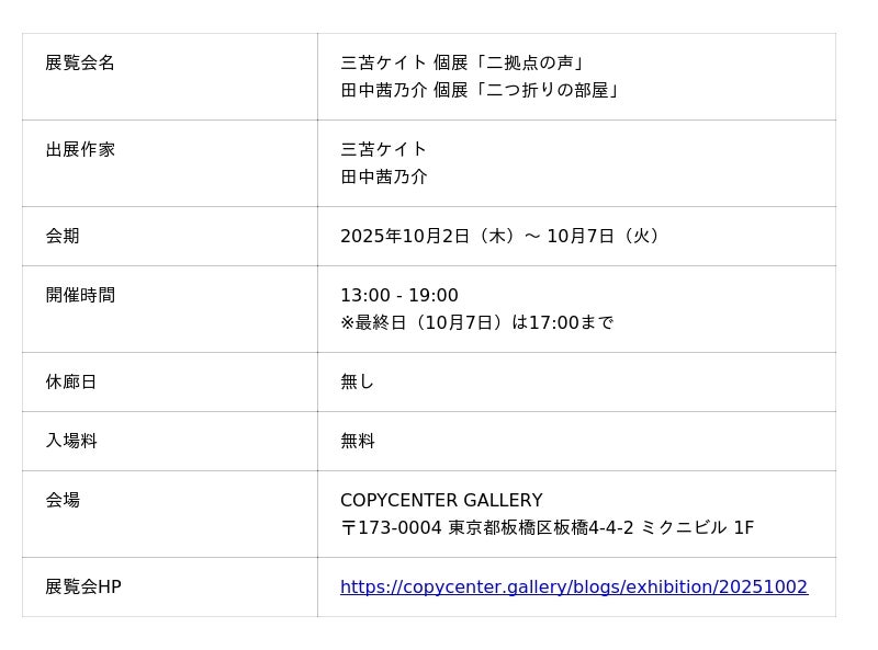 この度、アートギャラリー「COPYCENTER GALLERY」(東京・板橋、運営:株式会社PHOTOPRI)は、2025年10月2日(木)から10月7日(火)まで、三苫ケイトによる個展「二拠点の声」と、田中茜乃介による個展「二つ折りの部屋」を同時開催します。