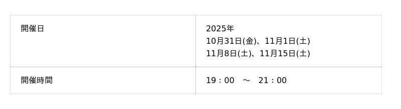 当ホテルでは、2025年10月31日(土)、11月1日(日)、11月8日(土)、11月15日(土)の4日間で