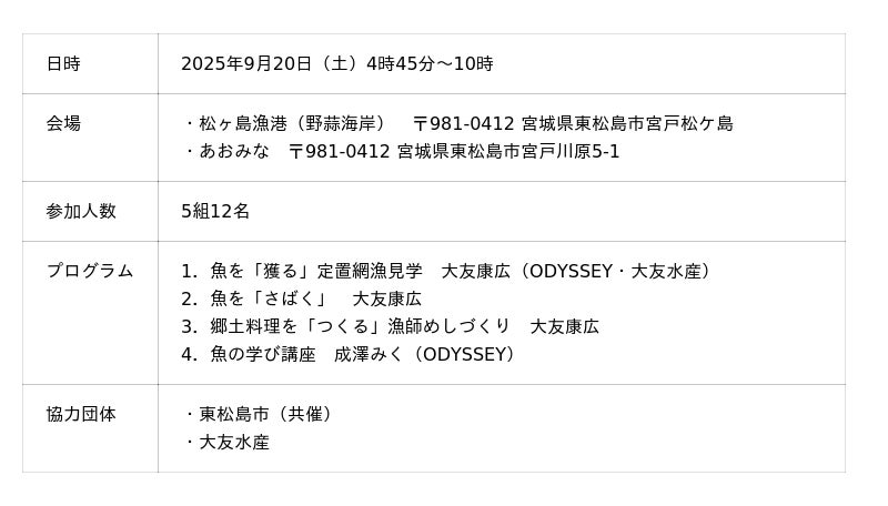 子ども達の感性や魚、海に対する好奇心を最大限に引き出す、一般社団法人ODYSSEYの教育カリキュラムと本プログラムは、“食べる”という体験を入口に、地域の自然や漁業、環境問題までつながっていることを実感する時間となり、参加者にとっては単なる調理体験を超えた、深い学びと気づきの場となりました。