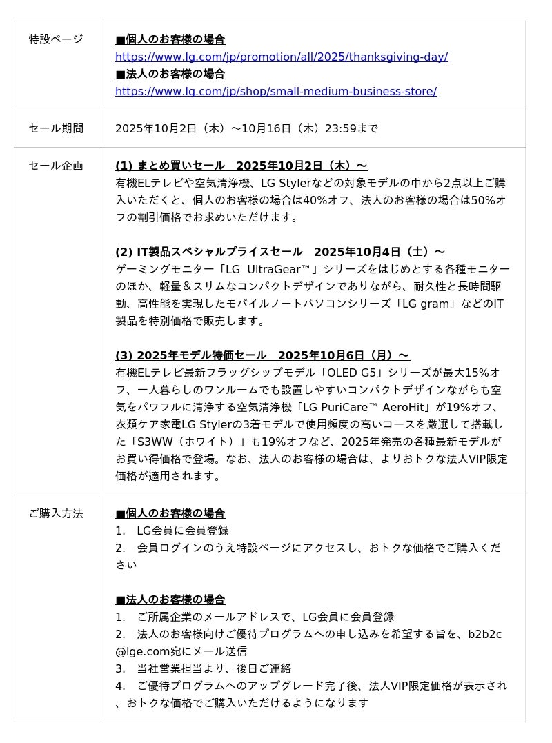 この機会にぜひ、LG公式オンラインショップ内『LG大感謝祭セール』の特設ページ(URL:https://www.lg.com/jp/promotion/all/2025/thanksgiving-day/)をご確認ください。