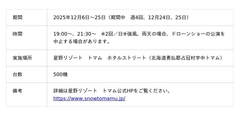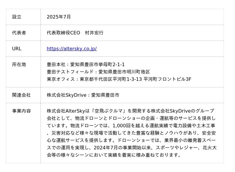 物流ドローン及びドローンショーの企画・運航サービスを提供する株式会社AlterSky(本社:愛知県豊田市、代表取締役CEO 村井宏行、以下「AlterSky」)は、2025年7月に株式会社SkyDrive(本社:愛知県豊田市、代表取締役CEO 福澤知浩、以下「SkyDrive」)のドローン事業部から分社化し設立されたことをお知らせいたします。また、星野リゾート トマム(北海道勇払郡占冠村、総支配人 渡辺巌)(※1)にて、日本初(※2)となるリゾート施設での長期常設型のドローンショーを2025年12月6日(土)から開始することをお知らせいたします。