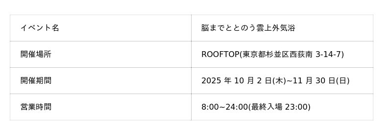 居場所事業、エンターテイメント事業を展開する株式会社メッセプロパティー(本社:東京都港区、代表取締役:宮本 茂)が運営する、本格的フィンランド式サウナ「ROOFTOP」(東京都・西荻窪)は、睡眠ソリューションカンパニー・株式会社ブレインスリープ(以下「ブレインスリープ」)とコラボレーションし、2025年 10 月 2 日(木)~11 月 30 日(日)の期間限定で『脳までととのう雲上外気浴』を開催いたします。