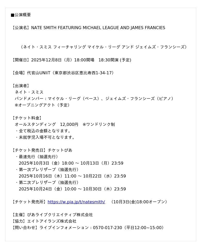 2025年12月8日(月)に東京・代官山UNiTにて「NATE SMITH FEATURING MICHAEL LEAGUE AND JAMES FRANCIES」の開催が決定しました。