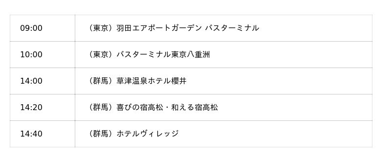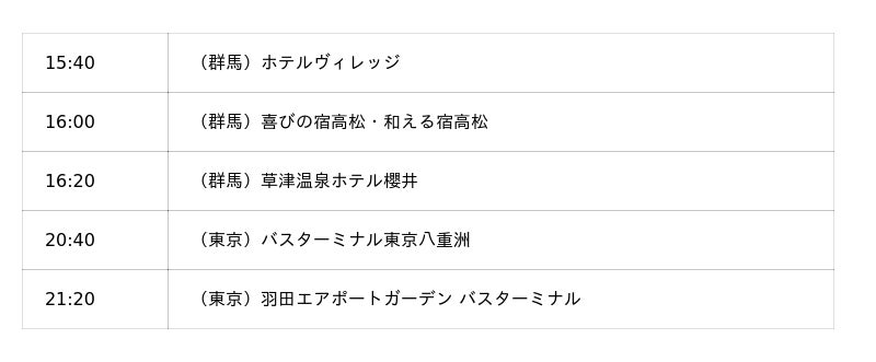 料金:羽田エアポートガーデン ― 草津温泉 片道3,500円(税込)大人・子供同額