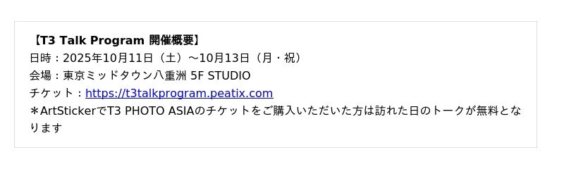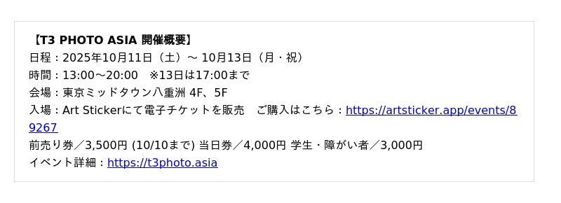 「T3 PHOTO FESTIVAL TOKYO」は、街を歩きながら作品を巡り、東京の新たな魅力を発見できる、日本最大級の都市型アート写真フェスティバルです。都市そのものを舞台に、多彩な写真作品との出会いを通じて、文化観光の楽しみを広げます。T3は、「写真」の力で東京をパリやニューヨークと並ぶ文化都市へと成長させることを目指し、国内外のアーティストや観客をつなぐ文化プラットフォームとして展開しています 。