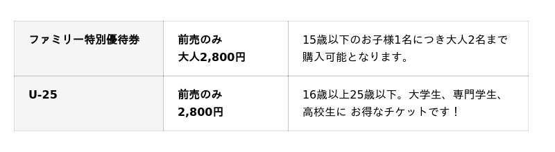 また、15歳以下のお子さまと一緒にご来場されるファミリー向けチケットや、16歳~25歳の方を対象としたU-25チケットを特別価格2,800円で販売中です。
