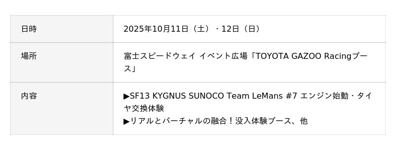 TOYOTA GAZOO Racingが体感&体験コンテンツを拡充!大人気のエンジン始動やタイヤ交換体験に加えて、リアルとバーチャルが融合したVR没入体験ブースが新登場!お子様から大人までお楽しみください!