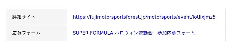 富士スピードウェイで10月10日(金)・11日(土)・12日(日)に開催する2025年全日本スーパーフォーミュラ選手権では、11日(土)・12日(日)の両日、「SUPER FORMULA HALLOWEEN」と称し、多くのファミリー層に楽しんでいただき、将来のクルマファン、モータースポーツファンを育むきっかけとして盛り上げてまいります。また、富士スピードウェイの所在地である小山町をはじめ、御殿場市、裾野市との地域連携パートナーシップを通じ、地域の皆様と共に、盛りだくさんのコンテンツで、すべての方に楽しんでいただけるイベントをつくりあげてまいります。