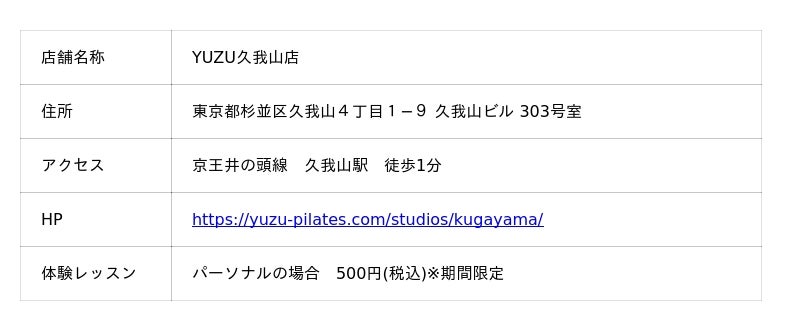 『マシンピラティスを生活の一部に』などの事業コンセプトを軸に、関東地方で勢力的にピラティスの普及に貢献しているパーソナルピラティススタジオ『YUZU』を運営するESS株式会社(caname株式会社のグループ企業、本社所在地:東京都目黒区、代表取締役 坪井里奈)は、2025年11月に久我山駅(住所:東京都杉並区久我山4丁目1−9 久我山ビル 303号室)に『YUZU久我山店』のオープンを予定している。YUZUの店舗数は60店舗(直営・FC合計)に到達する。