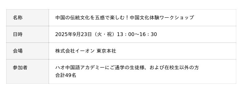 株式会社イーオン(本社:東京都新宿区、代表取締役社長:重野卓、以下「イーオン」)が運営するハオ中国語アカデミーは、開校20周年記念特別企画第7弾として、2025年9月23日(火・祝)に文化体験イベント「中国の伝統文化を五感で楽しむ!中国文化体験ワークショップ」を開催しました。本イベントはハオ中国語アカデミーにお通いいただいている生徒様のみならず、ご通学いただいていない方も含めた、49名の中国語学習者にご参加いただきました。