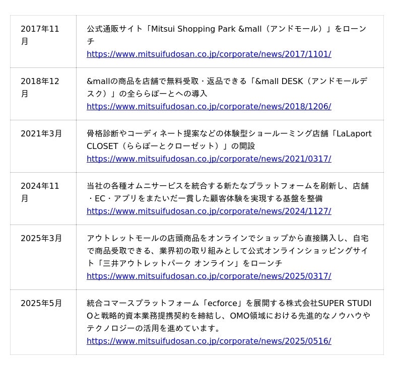 当社は、「三井ショッピングパーク ららぽーと(以下、「ららぽーと」)」を始めとする商業施設とECそれぞれの強みを掛け合わせて、新たな購買体験の創出や購買体験価値の向上を目指していく、「オムニチャネル戦略」を推進しています。2017年11月にららぽーと公式通販サイト「Mitsui Shopping Park &mall(アンドモール)」をローンチして以降、&mall注文商品の無料受取・返品を可能にする「&mall DESK(アンドモールデスク)」の全ららぽーとへの導入や、骨格診断やコーディネート提案の各種サービスが受けられる体験型ショールーミング店舗「LaLaport CLOSET(ららぽーとクローゼット)」の開設など、様々なオムニサービスを推進してきました。