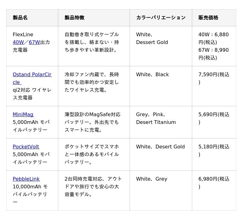 充電製品:FlexLine(40W/67W)、Qi2対応冷却ワイヤレス充電器Ostand PolarCircle、MiniMag(5,000mAh)、PocketVolt(5,000mAh)、PebbleLink(10,000mAh)