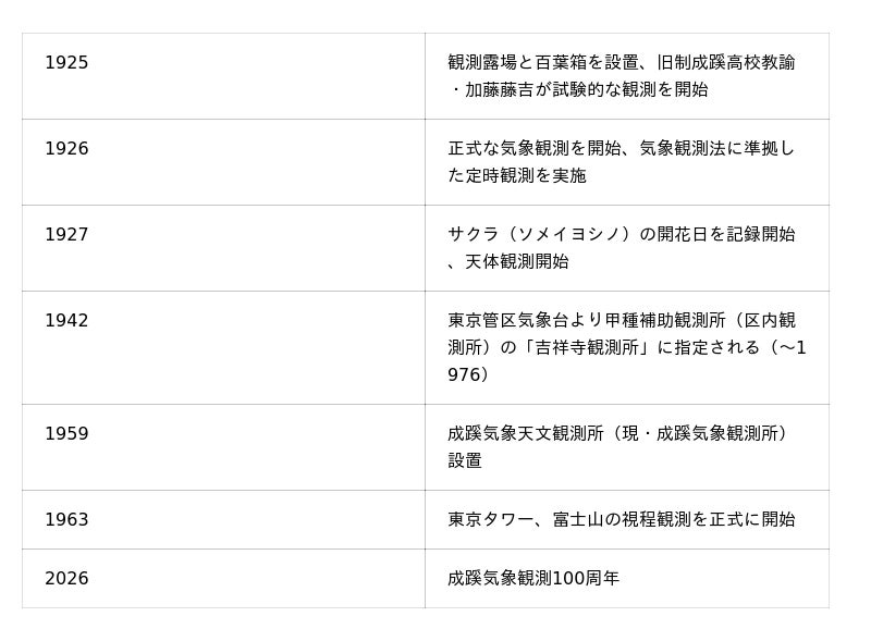 ■成蹊学園と気象観測について1925年に旧制成蹊高等学校の教諭であった加藤藤吉が「理化教育[1]」の一環として試験的な観測を開始。1926年1月から気象観測法に準拠した正式な観測を開始し、1942年には、東京管区気象台甲種補助観測所(区内観測所)の「吉祥寺観測所」に指定された。1959年には成蹊気象観測所(当初は成蹊気象天文観測所)を設置。正式な観測を開始してから現在までの約100年間、1日も途切れることなく気象観測が続けられている。今まで分析することが難しかったアナログで記録された気象データ(自記温度計などの記録紙に記録されたデータ)のデジタル化を推進し、科学的な分析により過去の気象現象を紐解く取り組みも実施している。