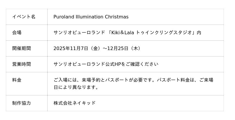 株式会社ネイキッド(英語表記:NAKED, INC.、所在地:東京都渋谷区、代表:村松亮太郎、以下ネイキッド)は、株式会社サンリオエンターテイメント(本社:東京都多摩市、代表取締役社長:小巻亜矢)が運営するサンリオピューロランド(以下、ピューロランド)で開催される『Puroland Illumination Christmas』とコラボレーションし、リトルツインスターズ(キキ&ララ)の50周年を記念したスペシャルイルミネーション『Twinkle Gift Night』を「Kiki&Lala トゥインクリングスタジオ」にて2025年11月7日(金)から12月25日(木)まで開催いたします。