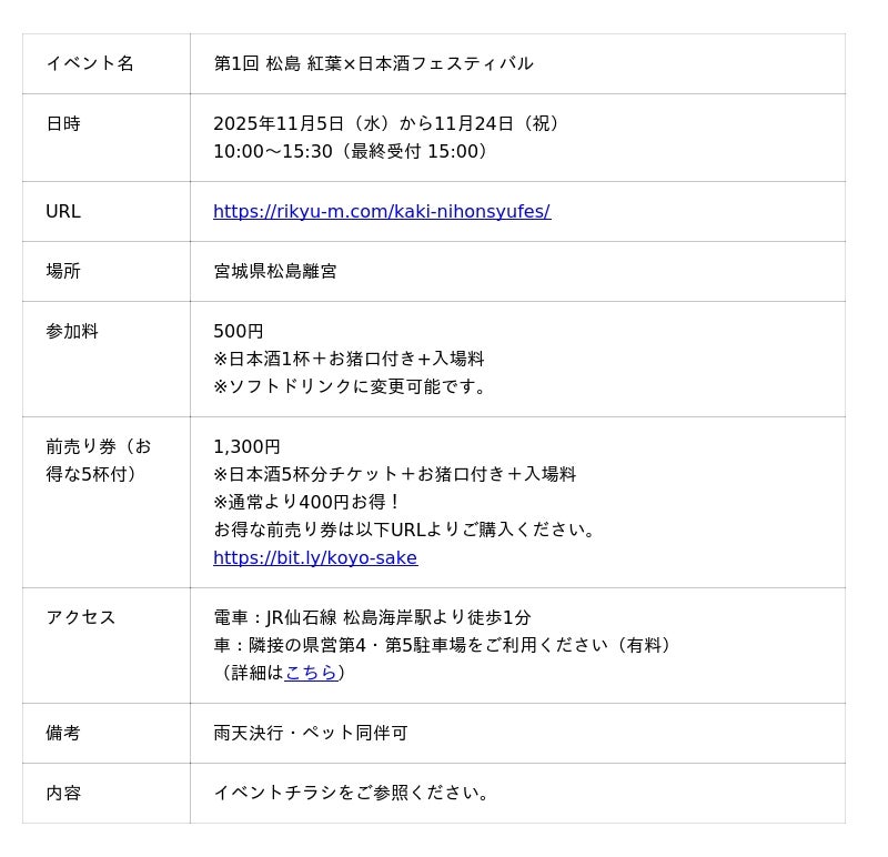 日本三景 松島にある観光複合施設「宮城県松島離宮」(運営:丸山株式会社)では、11月5日(水)より「第1回 松島 紅葉×日本酒フェスティバル」を開催します。